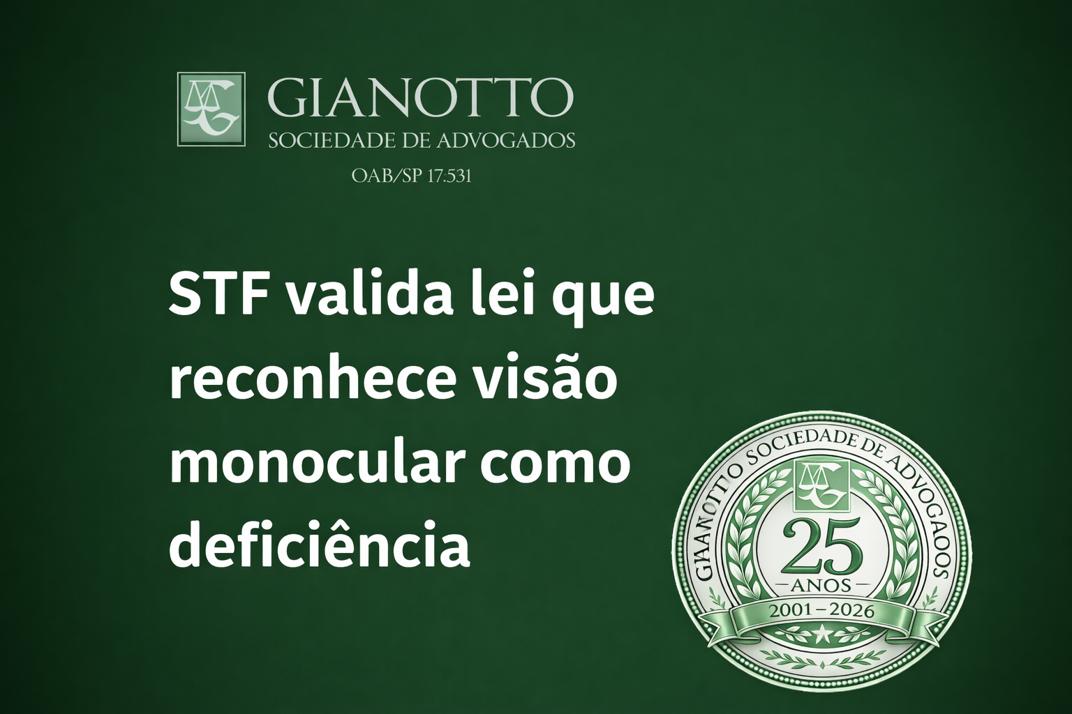O Supremo Tribunal Federal confirmou a constitucionalidade da Lei nº 14.126/2021, que classifica a visão monocular como deficiência sensorial do tipo visual para todos os efeitos legais.